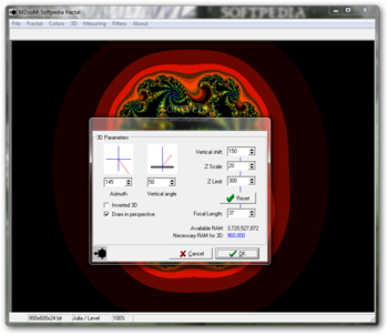 It's possible to personalize boundary colors, create new fractal centers, erase fractals, place markers, draw in 2D or 3D, rotate the color palette, convert 8-bit to 24-bit color depth or vice versa, find iterations, as well as to apply filters (e.g. edges, emboss), among others.