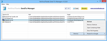 You can download Portable NoVirusThanks SendTo Manager which is 586.41 KB in size and belongs to the software category System. Portable NoVirusThanks SendTo Manager was released on 2015-02-15 and last updated on our database on 2017-04-04 and is currently at version 1.7.