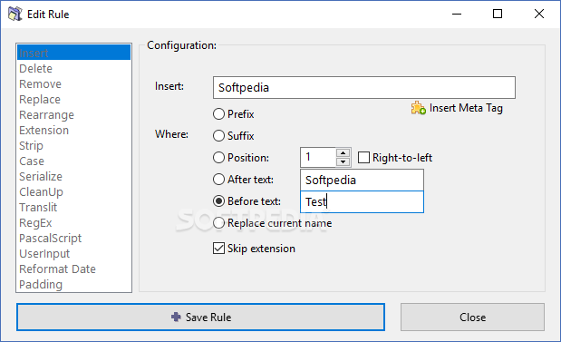 You can for example insert new characters in file names, delete, remove or replace some, change extension, capitalize every word, make all lower or upper case and even strip out content of brackets.