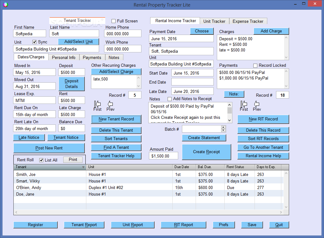 Records the tenant(s), manager, owner(s), and descriptions of all your rental properties. Unlimited # of units.