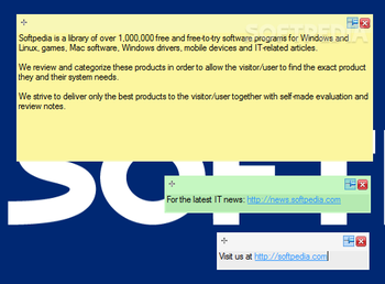 Virtual post-it notes are as easy to use as paper and far more flexible. They can store unlimited plain text content and they can be placed to your Windows' desktop or in the Post-it memoboard tab. They don't disturb you when using other programs. You can easily drag them anywhere in your desktop or roll them up in order to save screen space. Changing note colors is a snap. If you travel and use StarReminder on a USB stick, the post it notes will follow you in your trip.