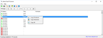 After finishing the scan operation, the program displays the resulting IP addresses directly on the main window, along with their ping values and host names, if available. However, if you want to update the last two values, you can do that manually by using the Ping or Resolve Hostnames functions in the main window's toolbar. Additionally, you can copy IP addresses and host names to your clipboard by right-clicking an item and choosing the appropriate option.