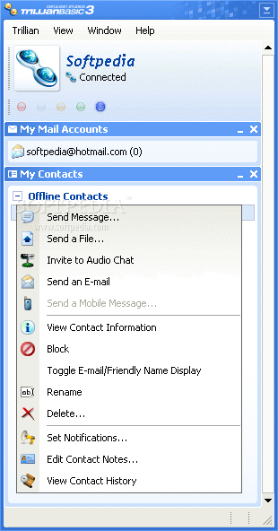 Without stealing your home page and with no other included software, pop-ups, or spyware, Trillian provides unique functionality such as contact message history, a powerful skinning language, tabbed messaging, global status changes (set all networks away at once), Instant Lookup (automatic Wikipedia integration), contact alerts, an advanced automation system to trigger events based on anything happening in the client, docking, hundreds of emoticons, emotisounds, shell extensions for file transfers, and systray notifications.