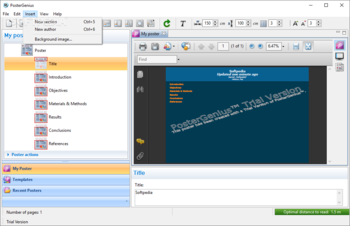 PosterGenius is a demo software by SciGen Technologies and works on Windows 10, Windows 8.1, Windows 8, Windows 7, Windows XP, Windows 2000, Windows 2003, Windows 2008, Windows Vista, Windows 2012.