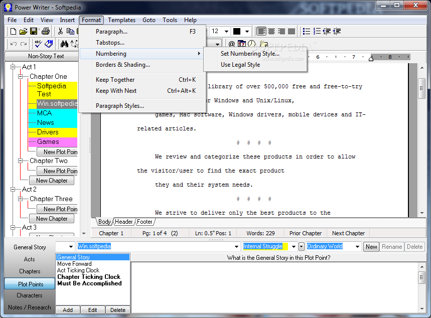 Simplicity of use - although extremely powerful, Power Writer is not trying to be absolutely everything to everyone as are most modern word processors such as Microsoft Word. This means that you spend your time writing, not fighting with it. Designed to handle anything from a short story to a multi-hundred page novel with all your notes, research, online references and more all in one document.