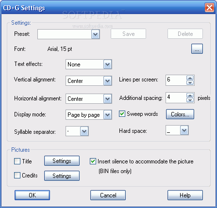 Advanced options allow to fine-tune the CD+G track (insert bitmaps, create duets, mix text with images, and more). Free Power CD+G Player is also included.