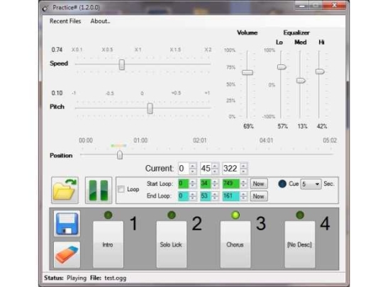 Practice# is a tool for practicing playing an instrument with playback music. It will turn your playing skills sharper! MP3, WAV, WMA, Ogg Vorbis and FLAC playback. Speed change - The ability to slow down or speed up music without changing its pitch. Pitch change - The ability to change the pitch of music up or down without changing its speed. Loops - Start and End Marker with Cue (waiting a few seconds before the loop starts, useful to get hands back into position). Persistent Preset Buttons - The biggest difference currently between Practice# and the other tools out there. In fact, that is why this tool was written by me in the first place.