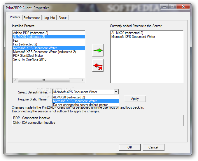 Print2RDP dynamically configures itself to present the user with a seamless printing solution allowing them to print any file from a terminal server environment directly to their local or network PC. Print2RDP is compatible with any available windows printer driver, including USB printers, network printers and even virtual printer drivers used in fax and document imaging applications.Limitations in the unregistered version15 days trial