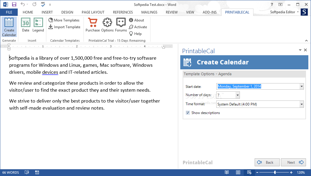 To create a new calendar, you simply need to follow a few quick steps that guide you throughout the whole process. Firstly, you can click the Create Calendar button, then choose a template from the right-hand corner of the screen and select a target, be it a new document or a currently opened one if you are using Word.