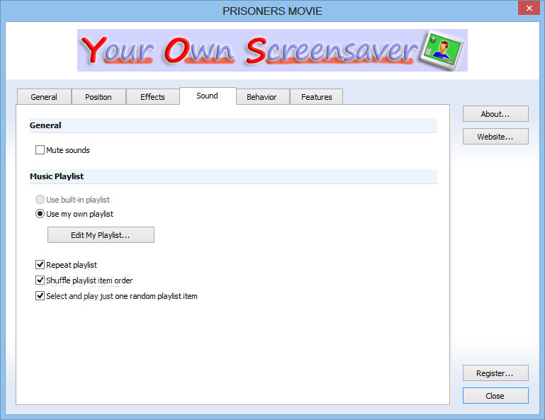 An interesting feature of PRISONERS MOVIE Screensaver is the fact that it allows you to create a playlist with songs from your computer. This way, you can listen to your favorite music, or the OST of the film, while the screensaver is active. The songs can be played on 'Repeat' or 'Shuffle' mode.