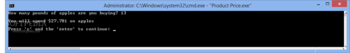With Product Price Calculator, you will also be given the opportunity to temper with the default product price list y entering the "nedyak" password when the program prompts for it. There is nothing special about this particular passwod other than it is actually the first name of the developer, backwards.