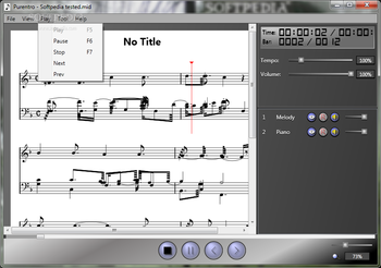 Purentro is a small but useful tool that was designed in order to provide you with a simple means of playing MIDI files. It also displays the sheet music and a cursor following the notes that are currently being played.System requirementsMicrosoft .NET Framework 4 Client Profile or .NET Framework 4