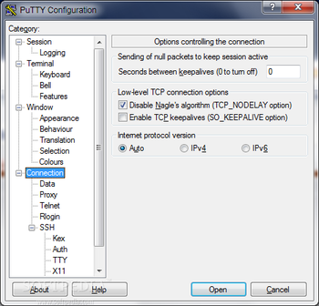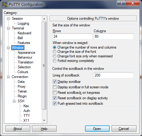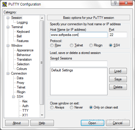 You need to mention the protocol, choose between raw, Telnet, Rlogin or SSH, the latter is automatically selected. There's the option to load, save or delete stored sessions on your computer and you can choose what the application does when you exit it.