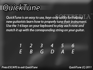 QuickTune is an easy to use, keys-only utility written to help new guitarists learn how to properly tune their instrument, or to simply serve as a reference for more experienced players.