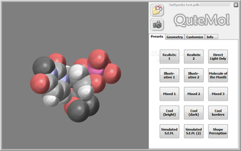 The QuteMol application was designed to be an interactive, high quality molecular visualization system. QuteMol exploits the current GPU capabilites through OpenGL shaders to offers an array of innovative visual effects.