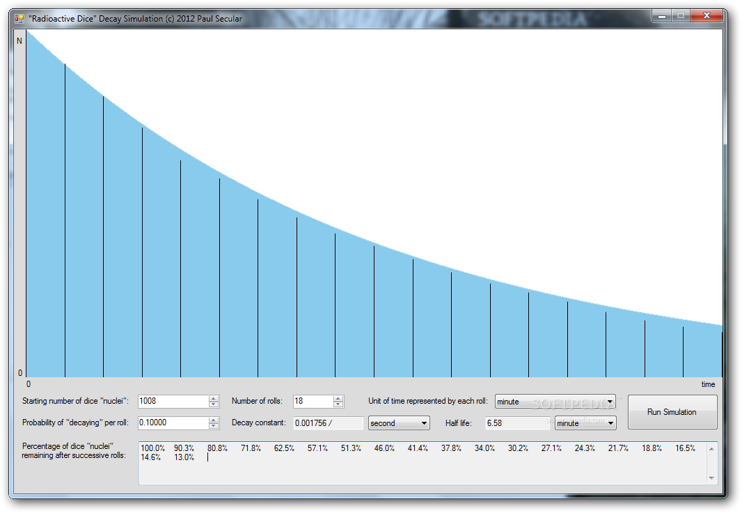This tool is designed to help you examine the probabilistic nature of the decay constant that is used frequently in physics.System requirements.NET Framework