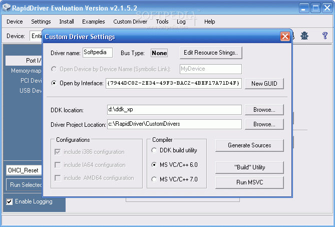 The Source Builder Edition of RapidDriver includes all the features of both the Explorer and the Developer Editions, plus the ability to generate the source code to a fully-featured driver for your device which has to conform to the Windows Driver Model (WDM). The resulting source code can be directly edited and compiled with MS Visual C/C++ or with the DDK "build" utility.Limitations in the unregistered versionOn each RapidDriver Explorer load/unload nag screen appears which cannot be closed for 5 seconds.