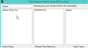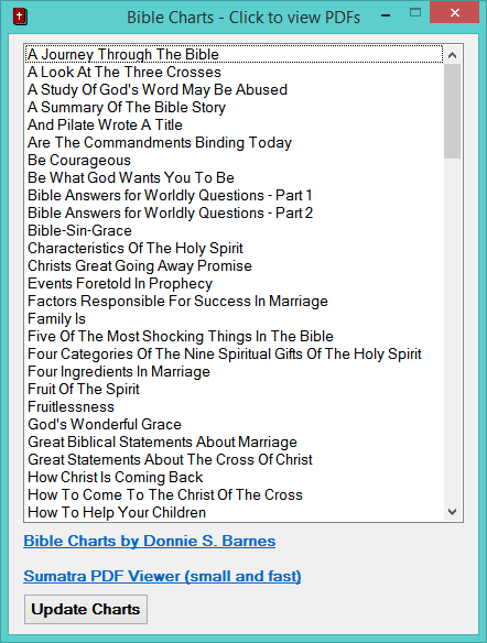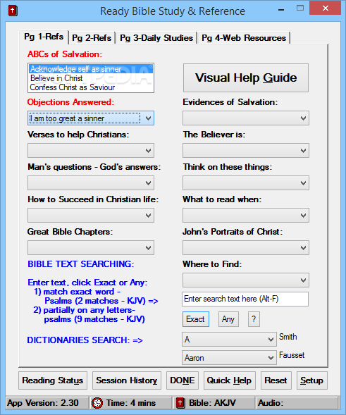 The application contains the following resources in a 10 megabyte download: 1. King James Bible 2. American King James Bible 3. Lexham Bible 4. (5) Daily Reading plans 5. (4) Devotionals: Morning and Evening, My Utmost for His Highest, Daily Light and One Day at a Time. 6. (3) Dictionaries: Smiths Bible Dictionary, Faussets Dictionary and King James Word List. 7. (3) Topical references: Torreys Topical Textbook, Naves Topical Bible and Thompson Chain References. *UNIQUE FEATURE* all of the Topical verse references are automatically expanded to their Bible text so the use doesnt have to look up anything. 8. Master Study Outlines for new and long time Christians. 9. How To Pray booklet. 10. Cross References of 150 topics with their associated verses. 11. (3) Commentaries: Matthew Henry, James Gray and Bridgeway Commentaries. 12. Fast Bible word searches, quick Dictionary finds. 13. Audio playback queue for multiple items to listen to. 14. Program saves the last items viewed or searched on. 15. Session timer, screen font, font size and window color customization. 16. Automatically puts the computer to Sleep or Hibernation if desired after Audio queue is finished. 17. RSS News Feed viewer, 18. Four (4) popup lists: Bible Verses, Bible Trivia, Bible Science and Famous Quotes, 19. Prophecy Calculator with related articles. No other software is required or needs to be installed. The software will run on older Windows XP Netbooks also.