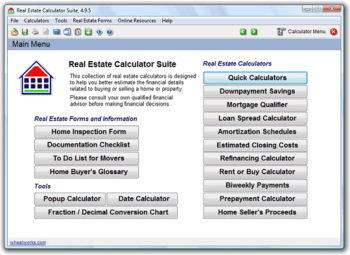 In addition to 16 real estate calculators, Real Estate Calculator Suite includes sample text for closing credit accounts, a Documentation List to help you gather your paperwork, a Movers To Do List, a Home Inspection form to help you review potential homes, a Fraction/Decimal Conversion Chart and useful tips for home buyers and sellers.
