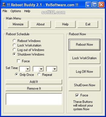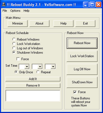 Reboot Buddy 2.1 automatically reboots the PC at the set time or on command. The application allows users to set multiple reboot times or reboot on Command, Reboot Buddy 2.1 allows user to Reboot, Logoff, Shutdown Lock workstation and also has a Force option, Can also run from the command line with command line options. Also can be run as a service - <a href="http://www.vsisystems . com / rebootbuddy . htm " > AutoReboot</a>