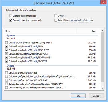 The tool shows the full path and size of each hive to give you the possibility to handpick the exact ones you want to include in the backup operation while excluding the rest. RegBak takes a snapshot of the current registry to copy each selected hive in the specified directory and to create an INI configuration file necessary to restore settings.