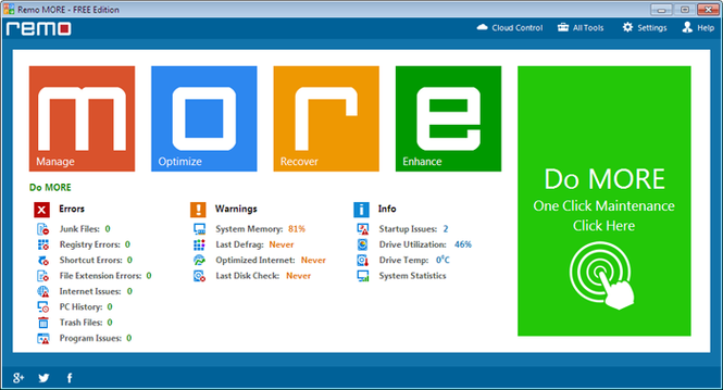 Are you tired of switching between different tools to maintain your Windows PC performance? Here is a unique app that can set you free from all the computer issues. Remo MORE Windows software is a complete package to resolve all the issues on your Windows computer. It lets you to remove cookies, clear browser history and invalid registry entries, examine hard disk health and temperature. This software facilitates one click maintenance option to scan and fix all the PC problems in one go. With this amazing software you will be able to manage, optimize, recover and enhance your system performance. It equips a user friendly interface, which enables you to operate it without any technical knowledge. Moreover, this application is portable and hence it can be carried in your USB drives.