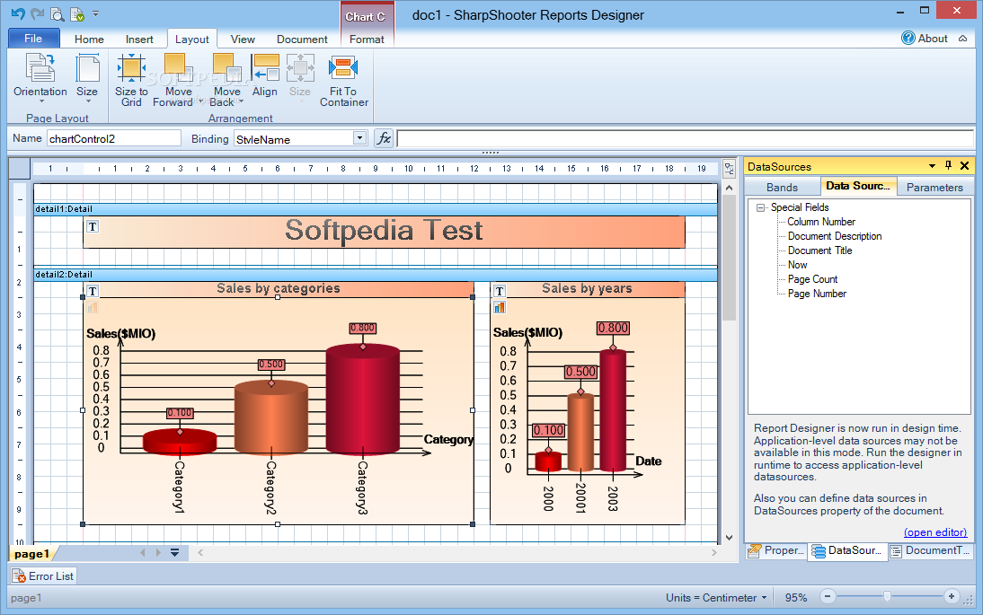 A built-in pivot table component allows dynamic data analysis and presentation in the form of OLAP reports. And a native charting component allows you to increase the graphical impact of applications with visually appealing charts and graphs. SharpShooter Reports introduces the advanced concept of a SideBySide band that allows placing separate report parts in parallel with horizontal shift.