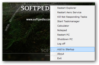At startup, Restarter creates an icon in the taskbar notification area and captures the user's attention by popping up a balloon messages. This represents the app's entire interface. By clicking this icon you can immediately restart Explorer or the Aero service in Windows 7, terminate all non-responding tasks, start Task Manager, restart, shut down or log off the PC, as well as access the Windows Calculator or Notepad.