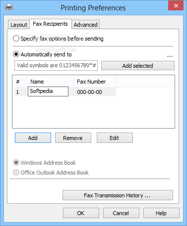 Your only task is to configure the printer preferences by entering the names and fax numbers of one or more recipients that will be receiving the original document. All the contact information can be safely stored in the address book and used at a later time, while previsouly sent fax messsages are found in the 'History' section.