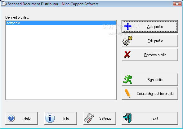 Scanned Document Distributor lets you define profiles. Each profile contains a scan action, followed by one or more actions to be performed on the scanned document(s).System requirementsA scanner that complies with the Twain standard