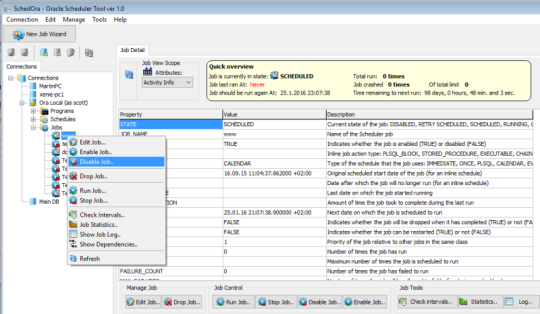 SchedOra is unique Windows desktop tool that enable to you easily schedule new jobs as well as monitor, control and change all existing jobs. Many built-in wizards and dialogs accelerate managing Scheduler objects and save your time. With SchedOra you will have all your enterprise processes based on Oracle Scheduler (DBMS_SCHEDULER package) under control.