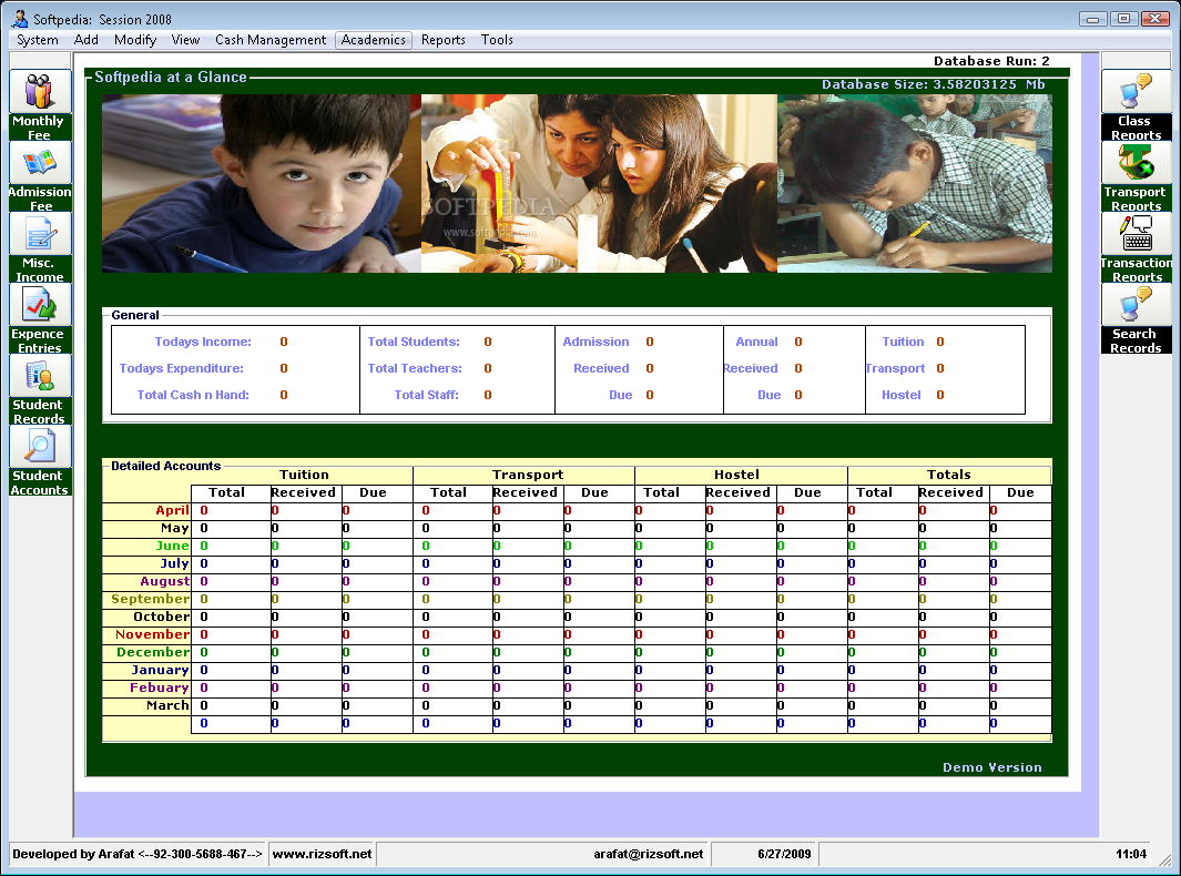 School Administration Made Easy automates Accounting and Accounts Management, Curriculum Management, Examination, Public Relations, Students and Employees Record Management and Reports Production.