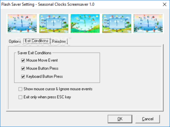 Furthermore, its possible to change the Flash size (full screen, exact fit, original), set the Flash quality (low, high, auto high, auto low) and pick the preferred background color. The screensaver exits to the desktop when moving the mouse cursor, clicking any mouse button or pressing any keyboard key. However, its possible to disable any of these three exit conditions, set Seasonal Clocks Screensaver to exit only when pressing the Esc key, or to show the mouse cursor and to ignore any mouse events.