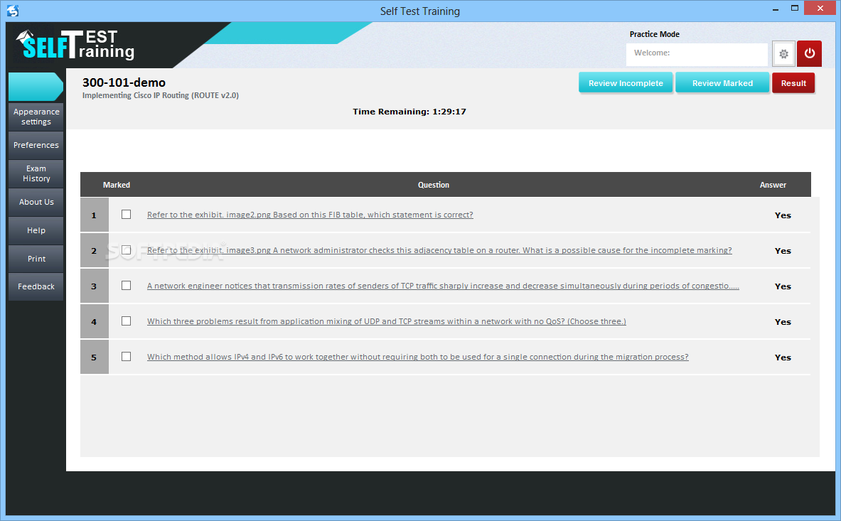 Self Test Training - Cisco 300-101 can save the scores for all the tests you take in Learning and Practice Mode. You may view these scores in the Exam History window and compare your performance over time. Moreover, you can change the passing score, layout style or the session timing, from the Preferences menu.