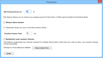 All the scores, for the tests taken in Learning and Practice Modes are saved in the Exam History table. The tool allows you to assess your progress and view certain details about the test, such as the duration or the number of unanswered questions. You can change the passing score and the timer for the Practice Mode sessions.