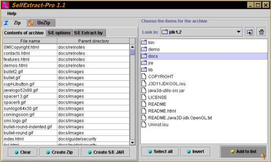 SelfExtract-Pro provides fast, easy to use zip/unzip capability plus the ability to create self-extracting JAR files. SE-Pro uses this property to allow you to create JAR files that can self-extract any files you choose to put inside them. SE-Pro JAR file options include JAR can extract into the current directory or prompt for the destination directory, can have a password in which case it wont extract the files unless you can enter the password, and can have a "extract-by" date after which the self-extractor wont function.