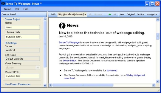 Sense To Webpage supports webpage editing without technical knowledge of HTML, PHP and JavaScript by extracting content to Sense, Silva Elms structured document editor, when straightforward plain text modification is needed. Sense To Webpage provides the potential for substantial cost and time savings as an alternative to expensive webpage-authoring tools and reliance on third-party web-designer services. WebPages are built by Sense To Webpage with XHTML strict or transitional 1.0 validation. A build option is provided to enable ROT13 email address encryption to counter spamming. Comprehensive ISO-8859-1 special character support is provided for the HTML.