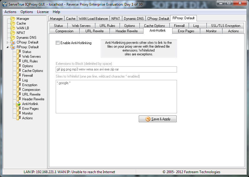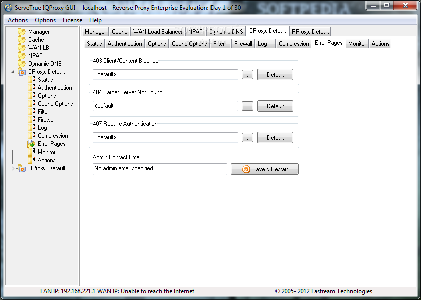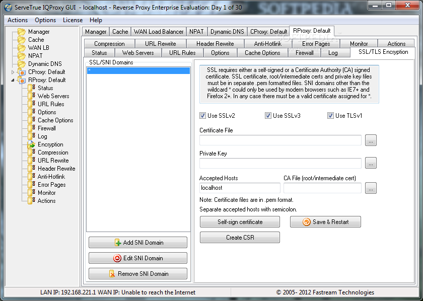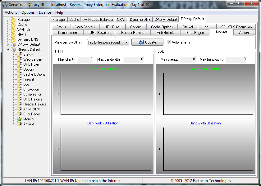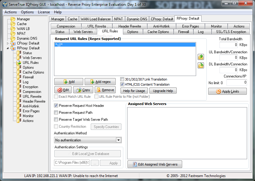 ServeTrue IQ Proxy is a robust and secure web content/reverse proxy server software for Windows. Fastream IQ Proxy Server can stand between the firewall and web servers and secure/accelerate your web site. It can also act as a forward proxy for sharing and filtering LAN web connection with caching.System requirementsPentium+ Processor