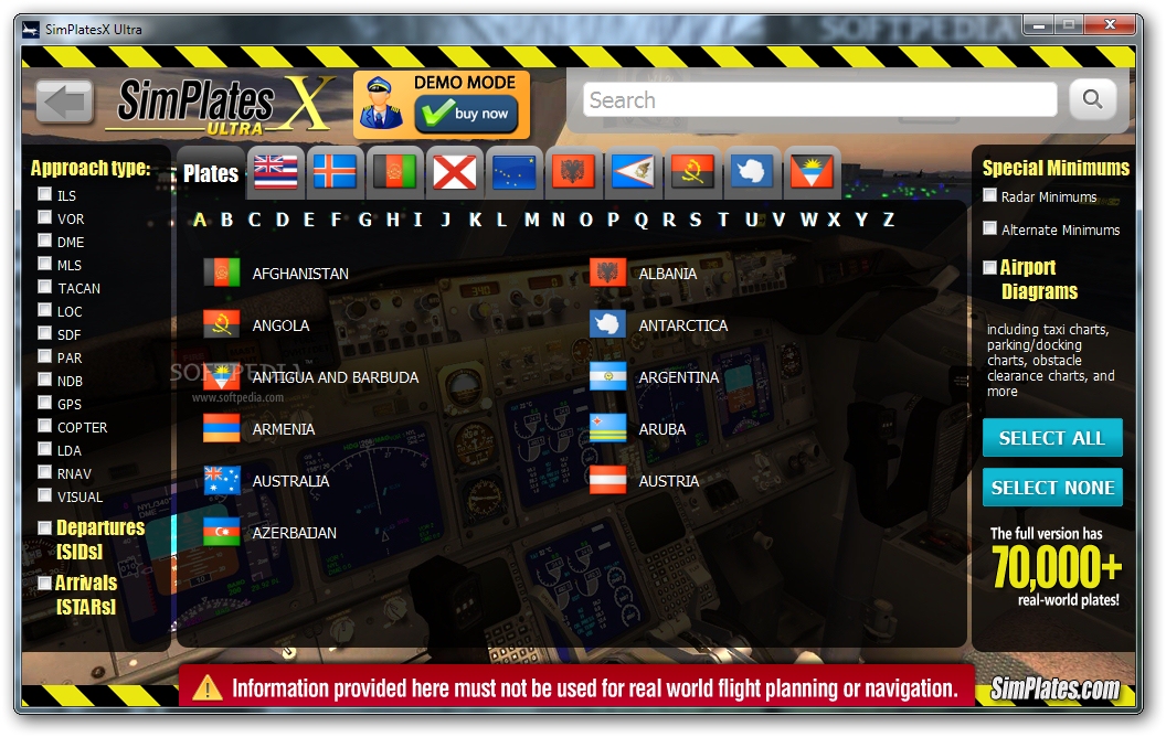 With the help of SimPlatesX Ultra you have the possibility to access real-world IFR plates and easily get NAVAIDÂ (navigational aid) information for each continent or country.Limitations in the unregistered versionYou can preview data only for Hawaii and Iceland plates