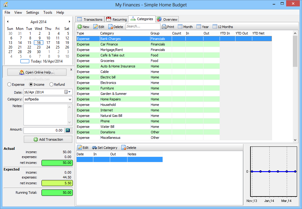 Analyze your expenses on the pie chart or history graphs (total or for specific category, one month, year to date or the last 12 months)