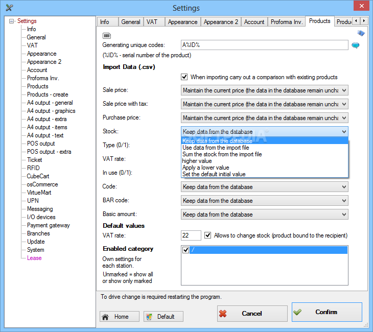 The application allows you to add any number of products and customize them in various ways. You can specify their price, VAT, stock, type, whether or not they are is use and many more.
