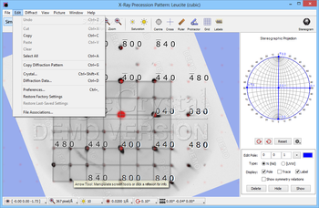 This is the core function of this utility, as it allows one to view the angular positions of vectors. For even more accuracy, one can load a diffraction image and compare the resulting patterns. The reflections can be labeled and the software allows users to measure parameters between diffraction spots, such as distances and angles.