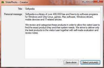 Photos are quite an important resource type in the modern world, being used for a variety of domains of activity, which can even mean textures in your favorite video game. Chances are you simply need to bundle them inside a presentation under the form of a slideshow, and if this is it, then clean applications like SlidePhoto can get the job done in no time at all.