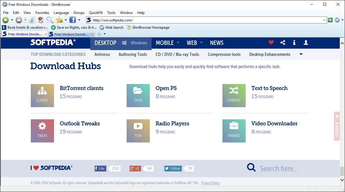 SlimBrowser [Softpedia Edition] is a free software by FlashPeak and works on Windows 10, Windows 8.1, Windows 8, Windows 7, Windows XP, Windows 2000, Windows 2003, Windows 2008, Windows Vista, Windows 2012.