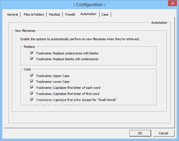 The settings screen is pretty decent, but you may want to have a look in the “Automation†tab to define the way your songs should be renamed. You can for instance replace underscores with blanks or vice-versa, use upper or lower cases, capitalize first letter of each or only the first word.