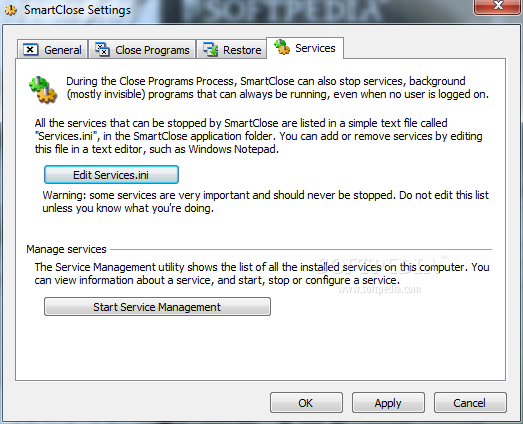 On modern Windows versions, SmartClose stops and restarts Windows services that can interrupt other processes, such as the Task Scheduler. On Windows 9x/Millennium, the Task Scheduler can also be disabled and re-enabled.