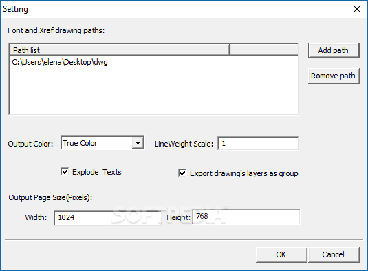 If you don't wish to convert all layouts, you can choose from the model and paper space. Furthermore, it's possible to add paths to fonts and Xref drawings, change the output color from True Color to black and white or gray, set the lineweight scale, and specify the size of the output page (width, height). You can also prevent the app from exploding texts and exporting the drawing's layers as a group.