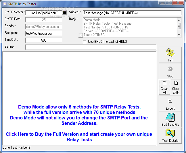 SMTP Relay Tester will try to connect to your SMTP server and will check if it is functioning as an "Open Relay" with several knowen and new methods, so you can be sure that your mail gateway will not be used by spammers to spread spam to the world. Prevent SMTP spamming from your server using this tiny application.Limitations in the unregistered versiononly 5 methods (full version more then 70)
