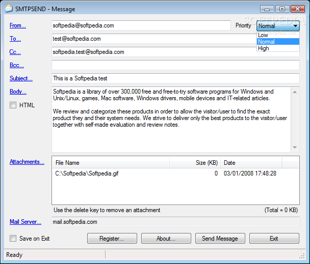 SMTPSEND is an application used to send mail messages without an email client required, such as Microsoft Outlook or Lotus Notes. An SMTP mail server must reside on your local network to process the email message sent out by SMTPSEND. Use fully qualified SMTP email addresses such as [email protected], not resolved names. You will be able to include a subject, the body, add an attachment, and enjoy numerous email recipients.
