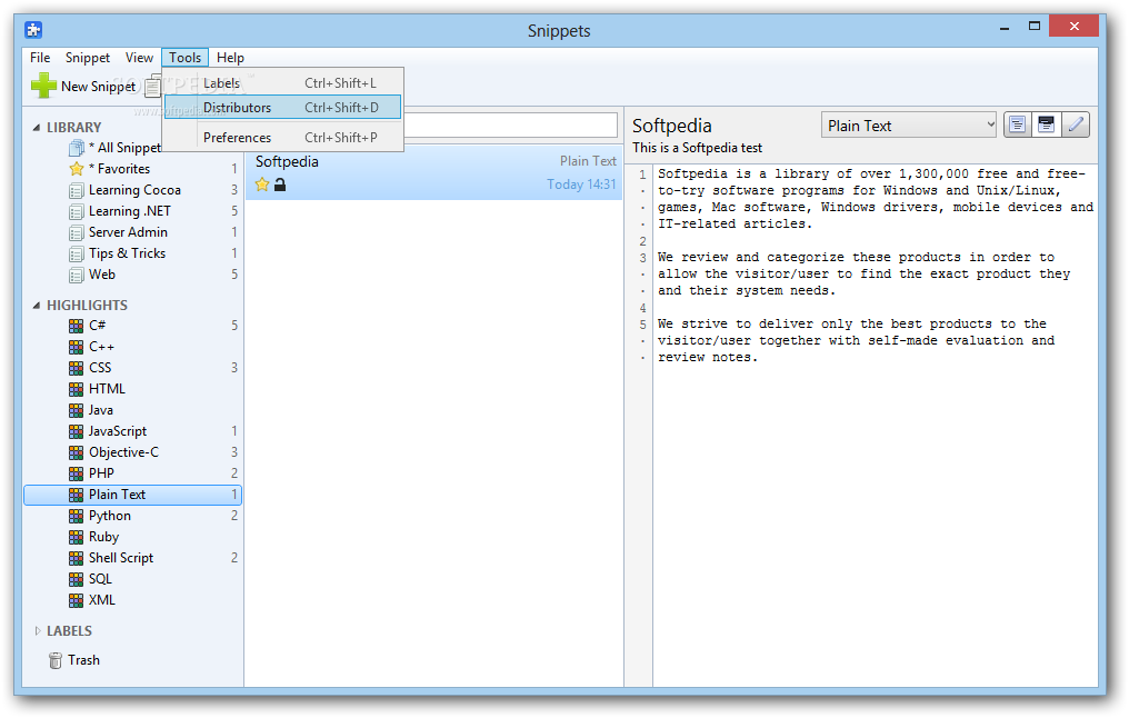 The interface is eye-catching and neatly organized, showing the library, highlights and labels in a well-structured manner. You can search within all snippets and quickly select the highlights, such as C++, C#, HTML, CSS, PHP, JavaScript, Python, Ruby, SQL or XML.